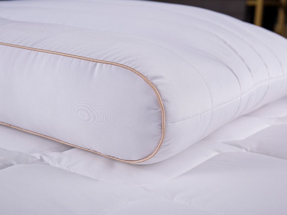 Det klassiske vatterte mønsteret med satengrør av gull gjør denne allsidige puten enda mer attraktiv. Undersiden av denne puten er fylt med myk fylling, og den høyere siden er fylt med høye resiliens og høystøttende fiber. Den lave siden er for side- og rygg, behagelig og myk. Den høye siden har god støtte, noe som kan bidra til å lindre nakkesmerter og lindre skulderstivhet.